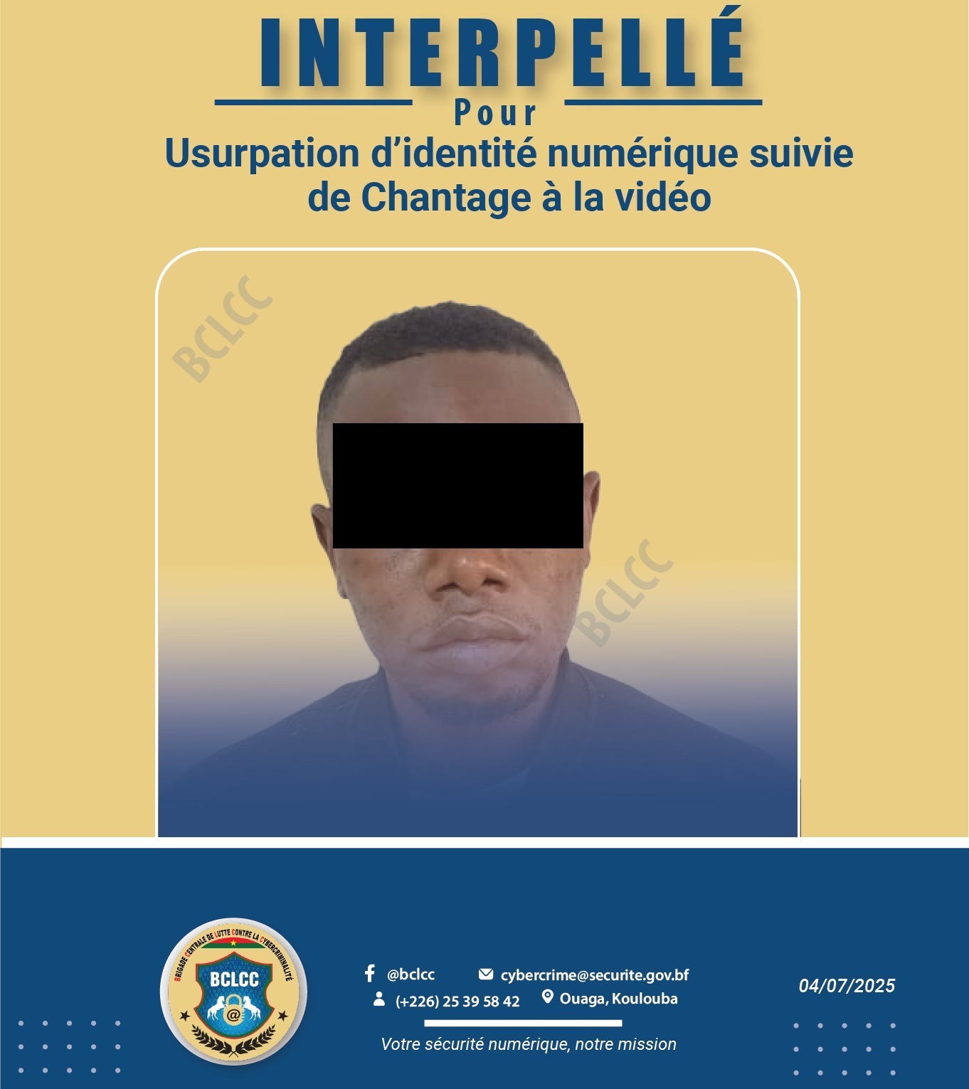 La Brigade Centrale de Lutte Contre la Cybercriminalité (BCLCC) vient de mettre un terme aux agissements d’un présumé cyber escroc, spécialisé dans l’usurpation d’identité au moyen des Technologies de l’Information et de la Communication (TIC), suivie de multiples cas de chantage à la webcam.