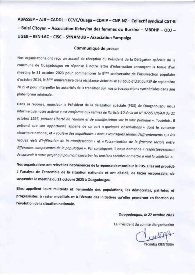 Nos organisations ont relevé les incohérences de la réponse de monsieur le PDS. Elles ont procédé à l’analyse de l’ensemble de la situation nationale et ont décidé, de façon responsable, de suspendre le meeting du 31 octobre 2023 à Ouagadougou.