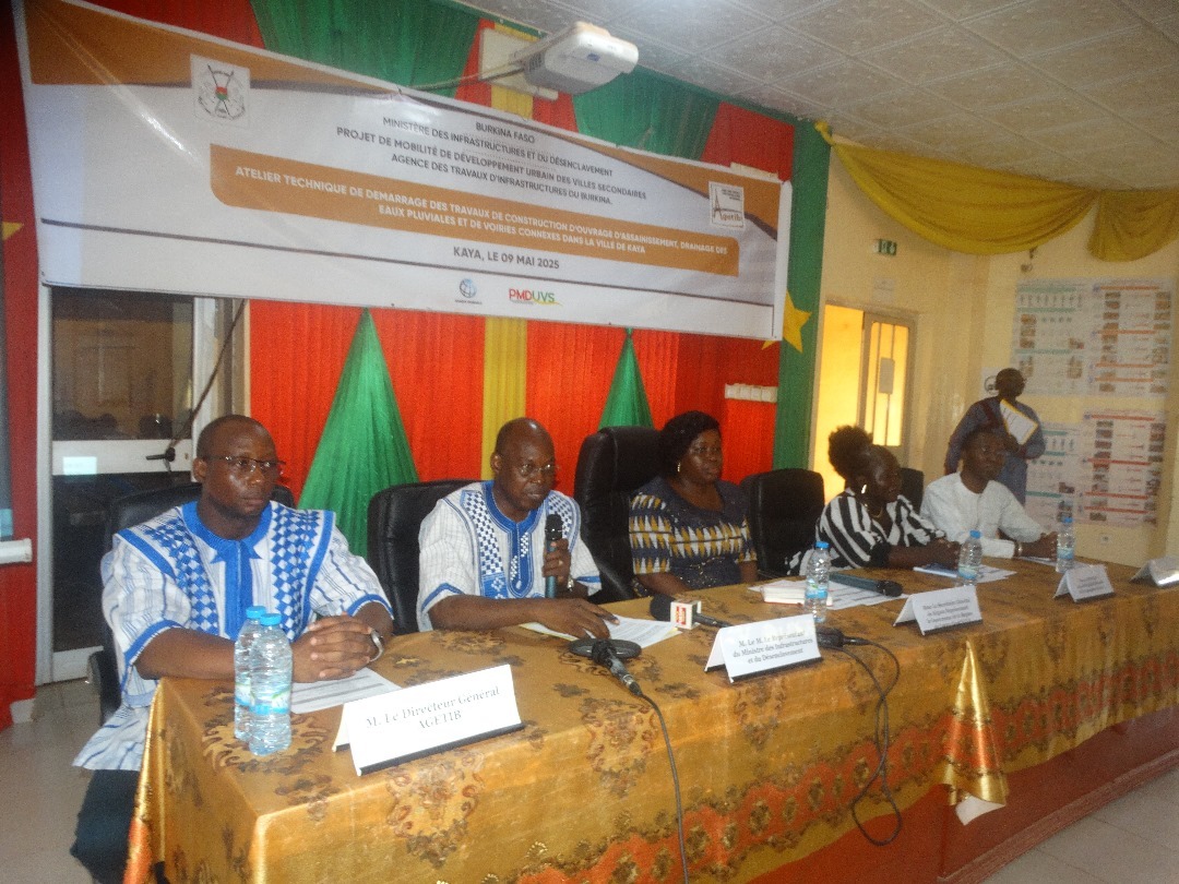 C’est sous la présidence du ministre des Infrastructures et du désenclavement représenté par son conseiller technique Abdoulaye Ouédraogo que les travaux de construction d’ouvrages d’assainissement et de drainage des eaux pluviales dans la ville de Kaya ont été officiellement lancés le vendredi 9 mai 2025 dans cette localité de la région du Centre-Nord. A travers un atelier technique de démarrage, les acteurs ont pu s’imprégner des travaux à réaliser et des enjeux de leur implication pour une mise en œuvre réussie du projet de mobilité et de développement urbain des villes secondaires à Kaya, d’un coût global de plus de 9 milliards de F CFA. Pour Ollo Franck Hervé Kansié, directeur général de l’Agence des travaux d’infrastructures du Burkina (AGITIB), les grandes activités du projet vont consister à l’aménagement et à l’entretien de 24 km du réseau d’assainissement, l’aménagement de collecteurs et de caniveaux et de voiries en terre et la prise en compte du volet environnemental entre autres. Il a poursuivi avec une description complète des travaux à réaliser tout en présentant les objectifs de l’atelier.