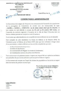 Dans un communiqué en date du 7 avril 2025, le gouverneur de la région de l’Est annonce la prorogation de la mesure d’interdiction de circuler avec les motos de type « ALOBA », « SANILI », « Fortune » ou de même nature ainsi que les tricycles, de jour comme de nuit (24h/24) à compter du 10 avril au 06 octobre 2025 inclus, sur l’ensemble du territoire régional ». Toutefois, il existe une exception à la mesure qui concerne la « ville de Fada N’Gourma dans ses limites urbaines prenant en compte les onze (11) secteurs ».